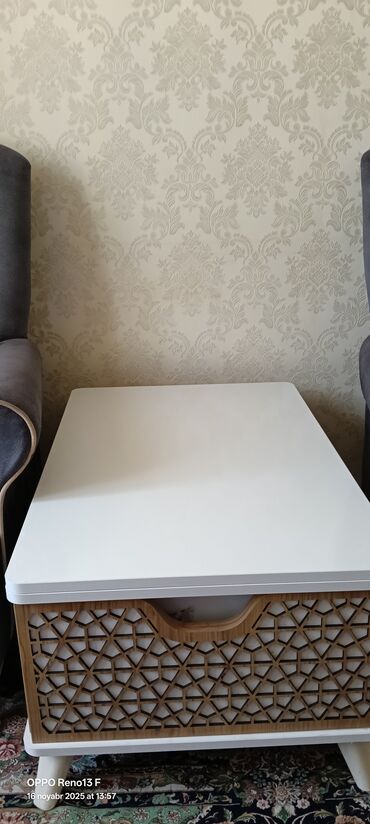 - 1 ədəd orta ölçülü jurnal masası. Ağ üstlük, alt hissədə ağac tonlarında dekorativ qəfəs naxışlı ön panel, mərkəzdə tutacaq kəsiyi, ağ ayaqlar.