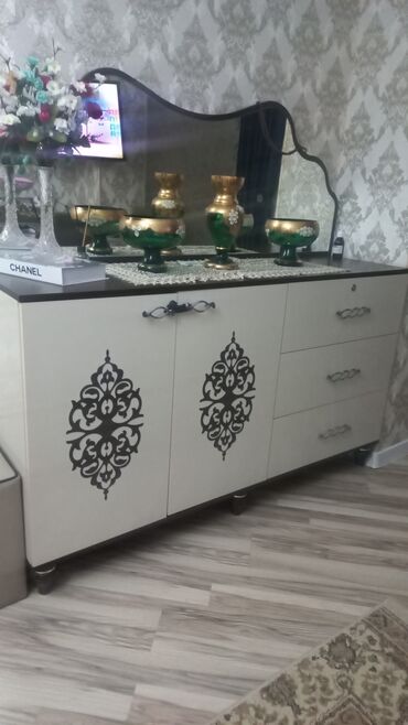 hamısı birlikdə 220m təcili evden cixmaldi Tərkibi: - Geniş bufet-konsol: üst hissəsində iri dekorativ güzgü, geniş üst səth, alt hissədə 2 sürüşən qapı; qapılarda naxışlı dekor. - Vitrin şkaf: 2 ...