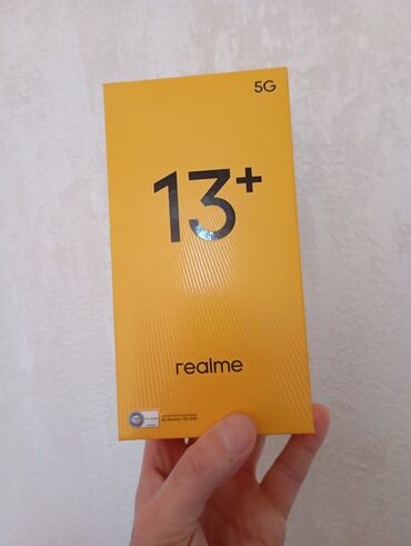 Qutu təsviri: realme 13+ 5G sarı qutuda; arxasında əsas xüsusiyyətlər qeyd olunub (Dimensity 7300 Energy, 80W şarj/5000 mAh, 120 Hz OLED, Sony 50 MP OIS). Arxa qapaq tünd bənövşəyi/boz tonlarda, dairəvi kamera bloku və “realme” loqosu ilə.