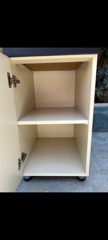 - Komplekt: geniş iş səthi + yuxarıda açıq rəf bölməsi + iki ədəd alt dolab modul