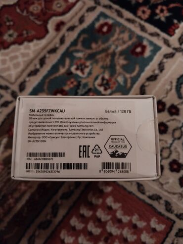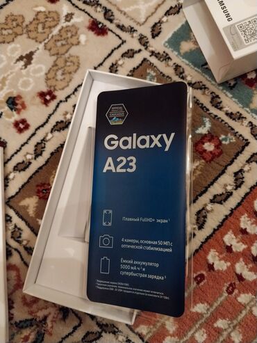 Qutusu üzərində Galaxy A23 qeydli, ağ korpuslu model. Şəkillərdə telefon və qutu göstərilib.
