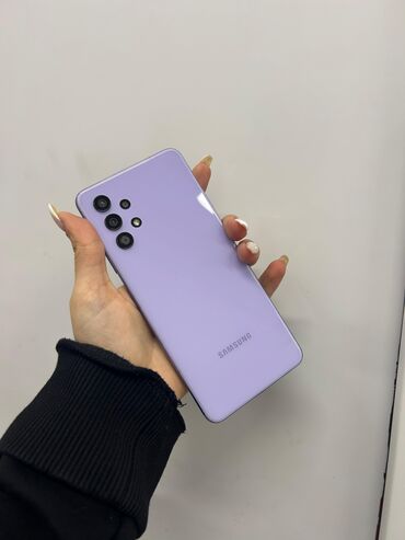 Samsung Galaxy A32, bənövşəyi rəng. Xüsusiyyətlər: - 6.4" Super AMOLED ekran, ön paneldə mərkəzləşdirilmiş kamera dəliyi - Çoxkameralı arxa modul: dörd obyektiv və LED işıq - Yan tərəfdə barmaq iz...