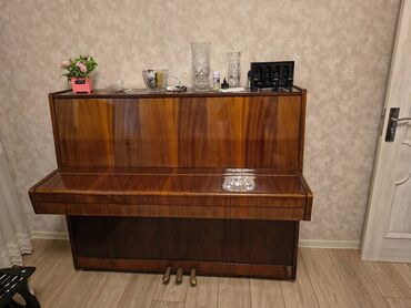 Upright pianino – klassik ağac örtüklü korpus, parlaq laklanmış səth.