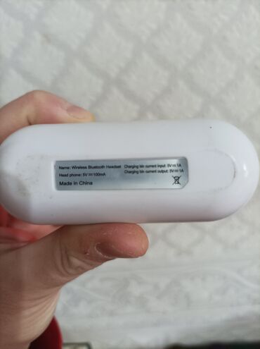 - Etiket məlumatı: “Wireless Bluetooth Headset”; qulaqcıq şarj tələbi 5V⎓100mA; şarj qutusu giriş/çıxış 5V⎓1A