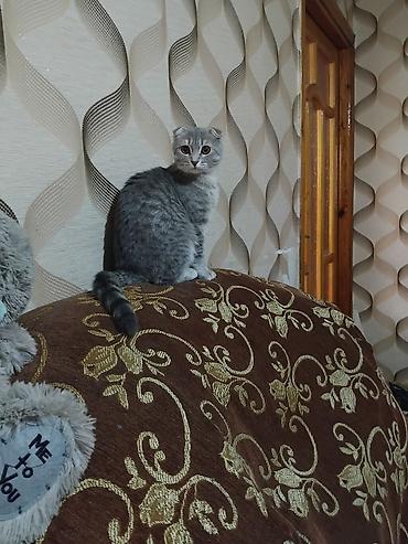 Skotiş Fold tipli, bozumtul zolaqlı tüklərə və qıvrıq-qulaqlı baş quruluşuna malik ev pişiyi.