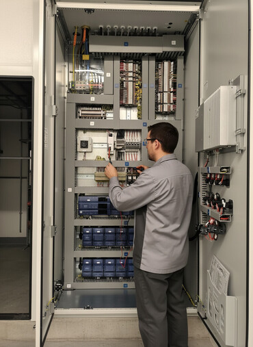 - Sağ tərəfdə montaj edilmiş yardımçı modullar: kontaktor/rele qrupları, qoruyucu elementlər və interfeys blokları
