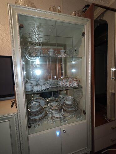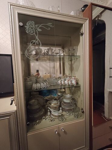 Klassik üslubda vitrinli bufet - Material: ağac karkas, ön hissədə oyma dekor elementləri və bürünc tonlu dəstəklər - Rəng: isti qoz/ağac çaları - 3 qapılı vitrin bölməsi: hər qapıda şüşə panellər...