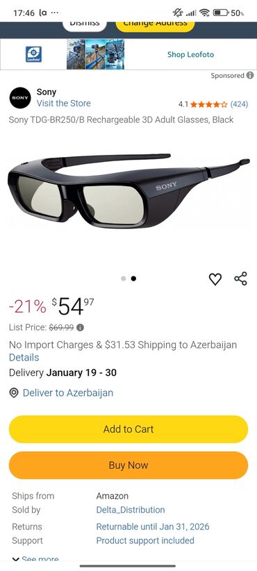 Məhsul: Sony TDG-BR250 3D eynəklər hamsı orginaldır qutuları var biri 10 AZN ancaq Sony televizorlar da işleyir