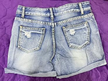 Terranova Original Denim cins şort - Ölçü: XS (etiketdə 36 göstərilib) - Material: orijinal denim - Rəng: klassik mavi - Model: yırtıq detallı, xam kəsimli ətək ucları - Dizayn: fermuarlı və düymə...