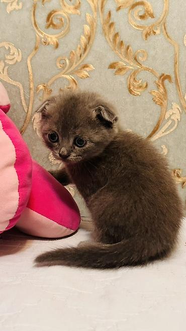 Skotish Fold balaları – boz rəng, qısa və ipək kimi tüklü, yumru üz, iri ifadəli gözlər və tipik qatlanmış qulaqlar. Xüsusiyyətlər: - Cins: Scottish Fold (qatlanmış qulaq) - Rəng: Bərk boz (blue/...