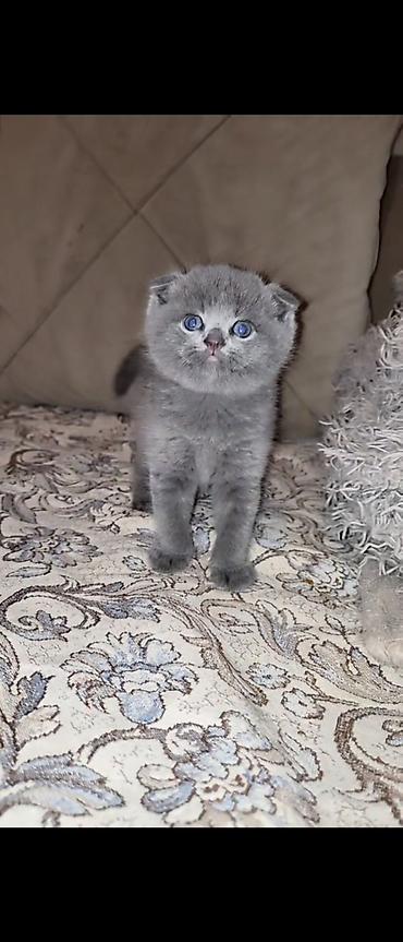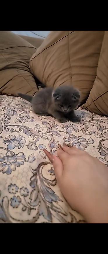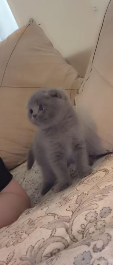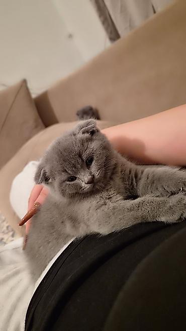 Şotland qıvrımqulaq balası (Scottish Fold) – boz rəng - Yaş: baladır - Rəng: vahid boz (blue/grey), sıx və yumşaq tük örtüyü - Qulaqlar: tipik qıvrılmış - Gözlər: iri, ifadəli - Xarakter xüsusiyyə...