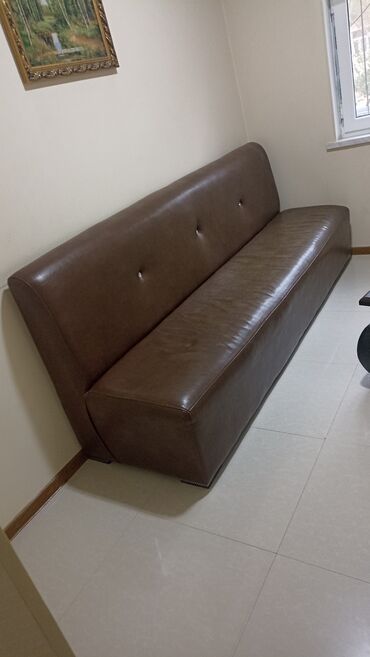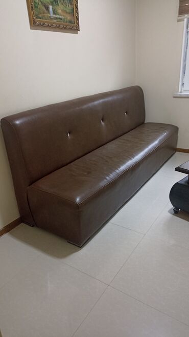 - Klinik gözləmə zonası üçün uzun dəri divan (qəhvəyi rəngdə), arxalı və yanları yumşaq, düymə dekorlu.
