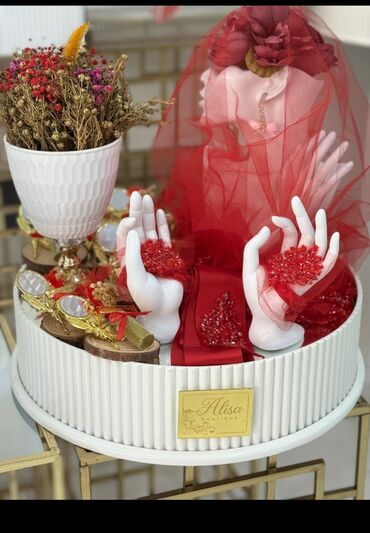 - Xonça/tray kompozisiyası: Ağ relyefli dairəvi baza üzərində dekor. Düzülüşdə dekorativ əl fiqurları, qırmızı tül və daşçıq elementləri, keramik vazada quru gül dəsti. Nişan, xına və xüsusi günlər üçün.