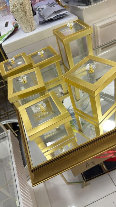 - Şüşə vitrin/qutu dəsti: Qızılı çərçivəli, şəffaf şüşə panellər, üst qapaqda kristalvari tutacaq. Aksessuar, xatirə və hədiyyələrin şık təqdimatı üçün.
