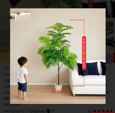 - Palma ağacı: ümumi hündürlük 135 sm. 47 ədəd geniş, dərin yaşıl yarpaq. Realistik gövdə və çoxşaxəli quruluş sayəsində yaşayış otağı, ofis, foaye və vitrinlərdə təbii görünüş yaradır. Qeyd: şəkillərdə göstərildiyi kimi qablara daxil deyil.