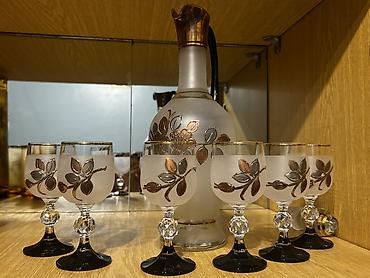 Şüşə qrafin və qədəh dəsti - Tərkib: 1 ədəd qrafin və bir neçə kiçik şərab/likör qədəhi 5 eded... - Material: qalın şüşə - Rəng və üslub: yaşıl şüşə əsaslı, üzəri qızılı rəng örtük və əl işi kimi ...