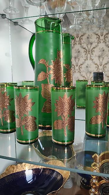Şüşə qədəh dəsti – karaf + 6 ədəd qədəh Istifade olunmayib. Yenidi. sehivede basqa qablarda var. - Material: qalın rəngli şüşə - Rəng və işləmə: zümrüd-yaşıl gövdə, qızılı örtük və əl naxışlı çiçək...