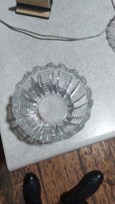 - 1 ədəd dairəvi büzməli kənarlı şüşə kasa (profilində spiral/kəsik naxışlar)