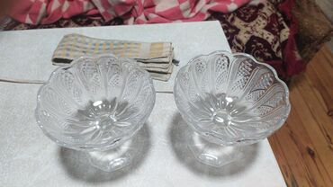 Şüşə/qədih dəstləri – 4 ədəd - 2 ədəd dərin qab: kəsimli naxışlı şüşədən, dairəvi formadır. Üstündə istehsalçı etiketləri görünür. Meyvə, salat, konfet və ya qəlyanaltı üçün uyğundur. - 2 ədəd ova...