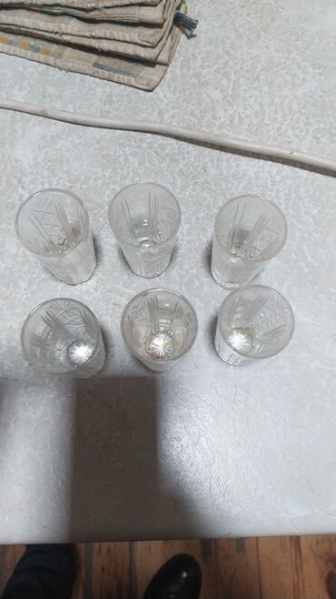 - 6 ədəd naxışlı şüşə stəkan: klassik kəsim ornamentləri, silindrik forma, çay/qonaqlıq üçün uyğundur.