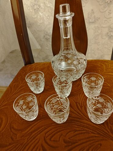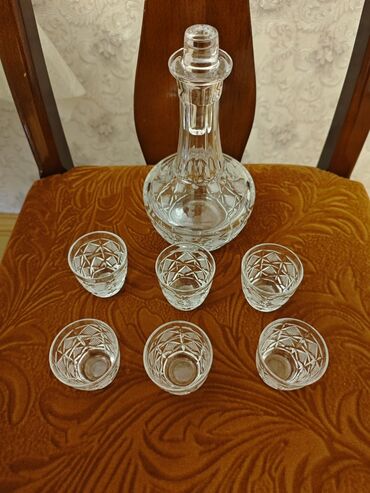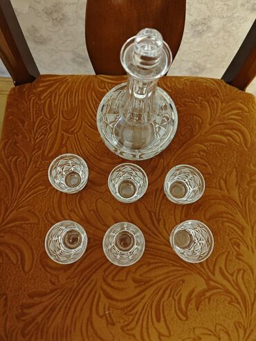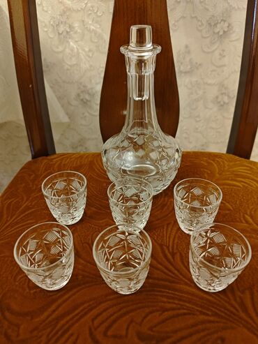 Kristal qrafin dəsti, altı ədəd rumkası ilə birlikdə. Qrafinin uzunsov boynu və geniş aşağı hissəsi var. Stəkanlar da qrafinlə eyni dizaynda, kristal naxışlarla bəzədilib. Həm qonaq qəbulu üçün, hə...