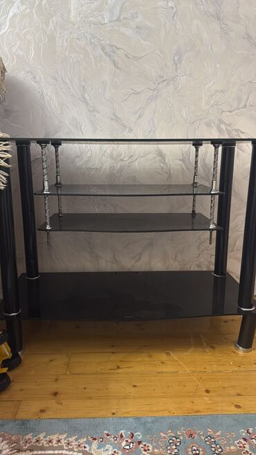 Şüşə TV stolik - Material: qara temperli şüşə səthlər, metal dayaqlar - 3 mərtəbəli konstruksiya: üst hissə TV və dekor üçün, orta rəflər DVD/TV tünər/receiver və digər avadanlıqlar üçün, alt rəf ...