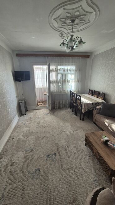 - Zal: geniş və işıqlı, dekorativ tavan rozetkası və çilçıraq, divardan asılan televizor, pərdə və tüllər, 6 nəfərlik yemək masası və stullar, L‑şəkilli yumşaq divan, taxta jurnal masası, xalça örtüklü döşəmə, eyvana çıxış.