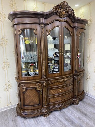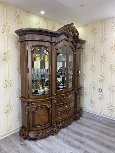 Klassik üslubda vitrin şkaf - Material: təbii ağac korpusu, dekorativ oyma və relyefli karnizlər - Rəng: isti qəhvəyi/ceviz tonları - Ön və yan panellər: şüşə, ekspozisiya üçün geniş görünüş - Dax...