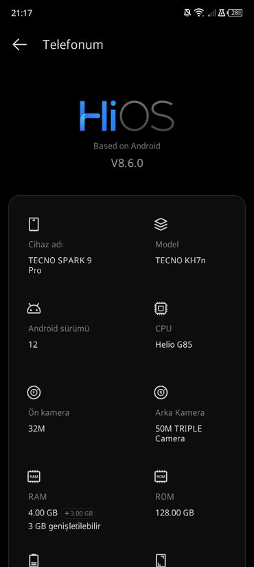 4 GBEndirim olacaq✅TECNO Spark 9 Pro (Model: TECNO KH7n) – Android 12, HiOS V8.6.0