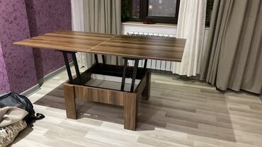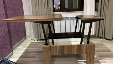 - 2-si 1-də dizayn: aşağı hündürlüklü kofe masası kimi istifadə olunur, mexaniki qaldırma sistemi ilə üst panel qalxaraq yemək/iş masasına çevrilir.
