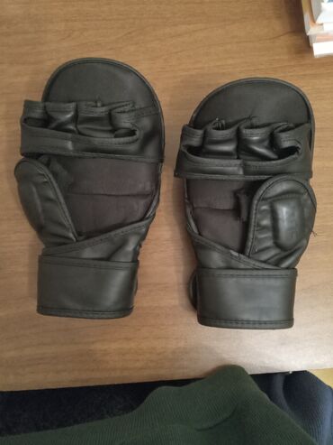 UFC üslublu MMA döyüş əlcəkləri - Material: qara dərimsi üst qat, iç hissədə nəfəsalan tekstil - Dizayn: açıq barmaqlı (fingerless) model, barmaq oynaqları üçün qalınlaşdırılmış yastıqlama - Üz hi...