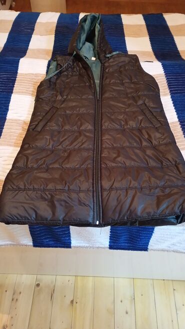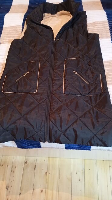 - Qara rəngdə kapüşonlu jilet. Üfüqi tikişli, bütöv fermuar, iki yan cib; iç hissəsi hamar astarlı, kapüşon iplə tənzimlənir. razmeri 50