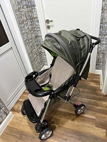 Uşaq arabası – yüngül çərçivəli, kompakt və rahat model. Xüsusiyyətlər: - Rəng: zeytun yaşıl üstlük, boz oturacaq döşəməsi (romblı tikişlə). - Geniş tənzimlənən tent/canopy – yanlarda reflektor zo...
