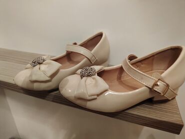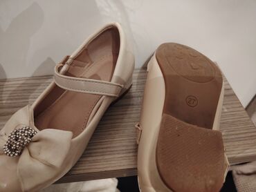 - Qız uşağı üçün krem rəngli baletka/ayaqqabı: Parlaq laklı üst, ön hissədə iri bant və bəzəkli broş detayı. Tək kəmərli toka bağlaması ilə tənzimlənir. Düz, sürtünməyə davamlı rezin altlıq. Altlığın iç tərəfində ölçü 27 qeyd olunub.