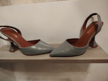 - Qadın ayaqqabısı (topuqlu, slingback): Boz rəng, ucu sivri dizayn. Arxa hissəsi açıq, elastik band ilə. Orta hündürlükdə heykəlsayağı formalı topuq, sabit və zərif görünüş verir. Dəriyəoxşar üst material, qəhvəyi içlik. Şıq tərz, ofis və xüsusi günlər üçün uyğun.
