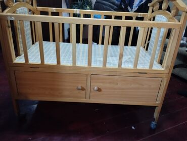 Uşaq üçün dəst: taxta beşik, portativ uşaq yuvası və yüngül uşaq arabası.