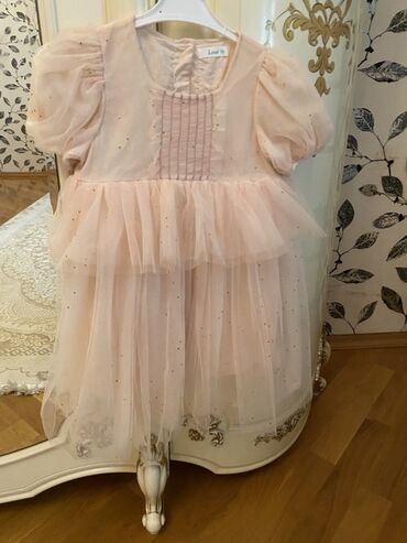 Uşaq üçün zərif ziyafət/libas paltarı - Rəng: açıq pudra/şampan tonları - Model: qolsuz, yuxarı hissəsi şəffaf tül qatlı, beldə incə mirvari bəzək xətti - Üst hissə: sinə boyunca həcmli tül güllə ...