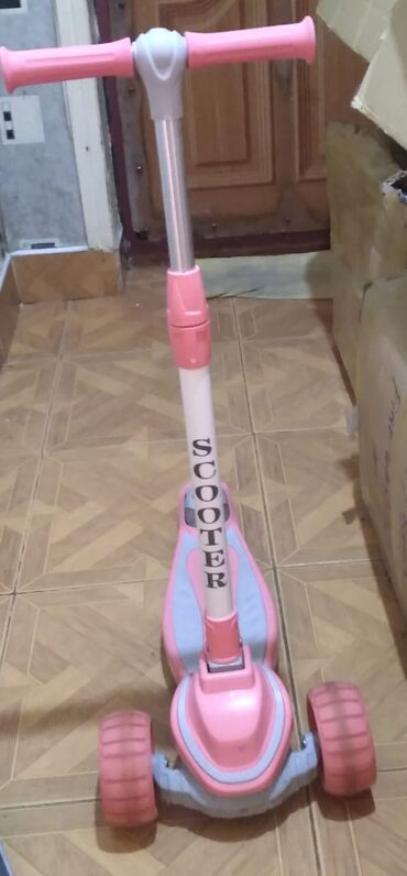 Uşaq skuterı – 3 təkərli, çəhrayı-boz rəngdə. 65 kg ağirlik göturu