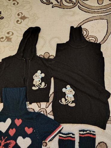 - Qara rəngdə kapüşonlu, fermuarlı kardiqan – ön hissəsində parıltılı siçan fiqurlu aplikasiya, aşağıda toxuma ciblə.