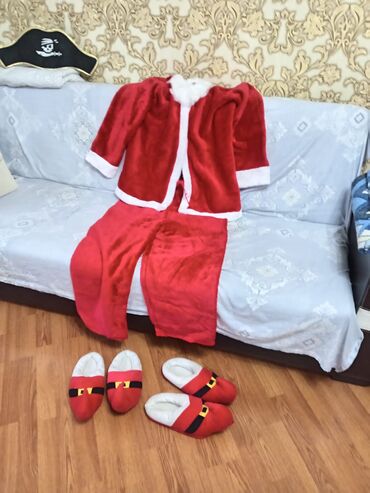 Uşaq tematik geyimləri dəsti 1) Yeni il/Dədə Qorqud (Santa) kostyumu: - Qırmızı məxmər tipli parça, ağ tüklü haşiyələr - Üst paltar (jaket) və şalvar - 2 cüt uyğun yumşaq ev terlikləri, qara kəmər...