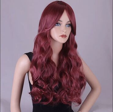 Məhsul: təbii görünüşlü, qırmızı-bordo rəngdə uzun dalğalı qadın pariki