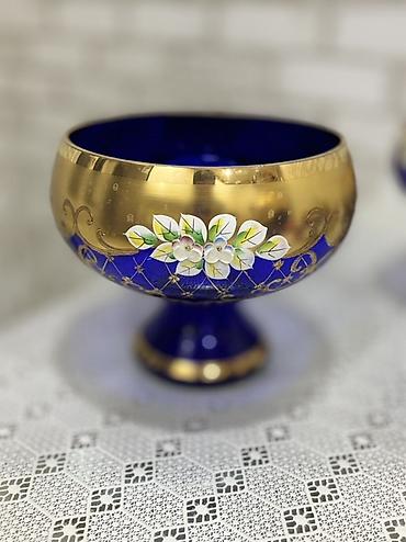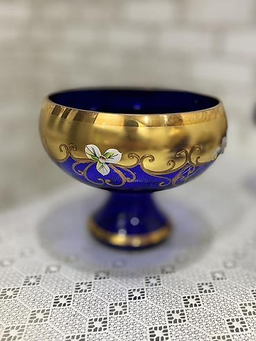 Büllur dekor dəsti – 3 parça - Tərkibi: hündür vaza, ayaqlı meyvə/qənd qabı, kiçik şirniyyat/konfet qabı - Material: qalın büllur-şüşə - Rəng: kobalt-mavi əsas, parlaq qızılı tonlarla boyanmış - N...
