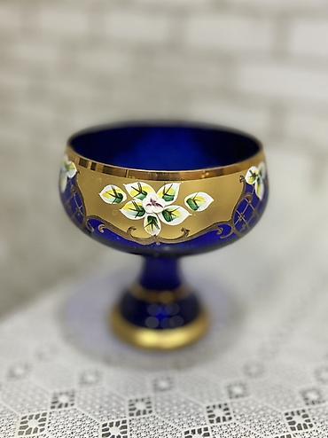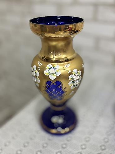 Böyük dekorativ şüşə vaza - Material: qalın şüşə - Rənglər: kobalt-mavi əsas, parlaq qızılı örtük - Bəzək: əl işi relif çiçək naxışları, ağ-yaşıl çiçəklər və zərif oyma ornamentlər - Forma: ensiz ...