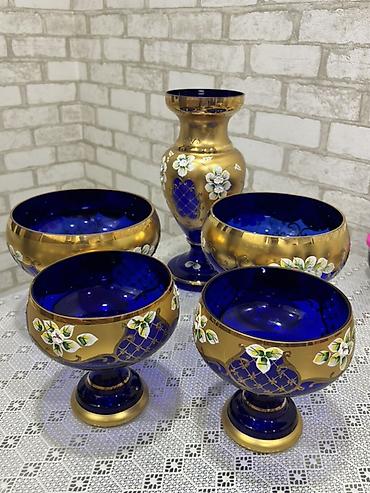 çexiya istehsalı. Məhsul: Boyalı büllur bəzək dəsti Təsvir: - Tünd kobalt-mavi şüşədən hazırlanmış 4 hissəli dekorativ dəst. - İki ədəd iri vaza, bir ədəd q...
