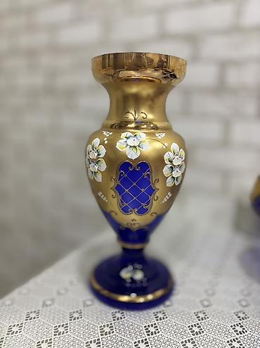 İki ədəd bəzəkli vaza dəsti - Material: qalın şüşə - Rənglər: kobalt mavi və qızılı tonlar - Dekor: əl işi relyef çiçək naxışları, zərif oymalar və şəbəkə ornamentləri - Üslub: klassik/barokko ilh...