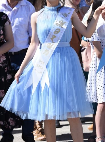 1 defe geyinilib ideal veziyyetde ozel tasarimdir! Zərif qısa don – açıq mavi/şaxtalı gümüş tonlarda, rellyefli jacquard (çiçək fakturalı) parça. - Yüksək yaxa, yarımdairə ətəkli A-kəsim siluet -...