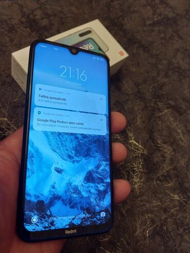 Xiaomi Redmi smartfon - Rəng: mavi parıldayan arxa qapaq - Ekran: damcı formalı çentiklə tam ekran panel - Arxa kamera sistemi: dik yerləşdirilmiş çoxlu kamera modulu və LED flaş - Barmaq izi oxuy...