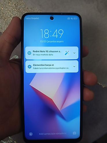 Xiaomi Redmi Note 9S – 6.67" tam ekran, mərkəzi “punch‑hole” ön kamera dizaynı. Göy rəngli parlaq arxa panel və kvadrat modulda dördqat arxa kamera. Əsas xüsusiyyətlər: - Model: Redmi Note 9S - Ya...