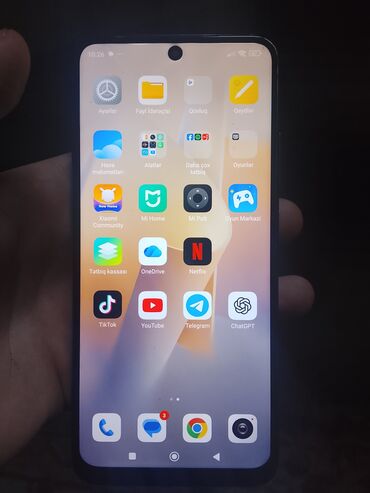 Xiaomi Redmi smartfon - Ekran: tam ekran dizayn, damla formalı ön kamera çıxıntısı. MIUI interfeysi, Azərbaycan dilində menyular. - Arxa panel: mavi-yaşıl gradient şüşə örtük, barmaq izi skaneri a...