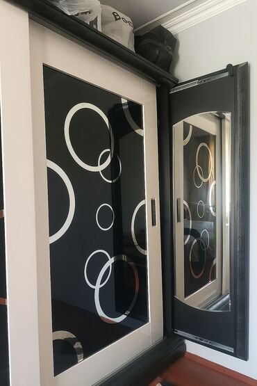 Sürgülü qapılı şkaf - Model: 2 qapılı, güzgülü sürgülü sistem - Rəng variantları: ağ (parlaq panellə) və tünd qəhvəyi - Material: laminat/MDF panellər, alüminium rels və çərçivə - Ön hissə: bir qa...
